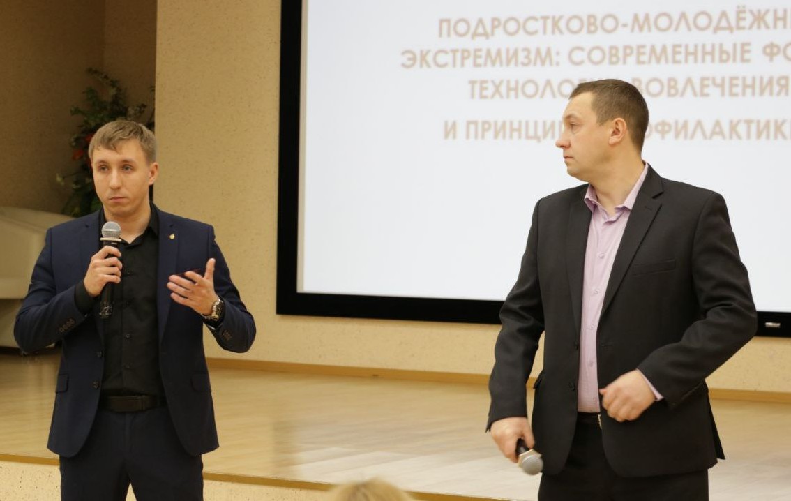 Сотрудниками Центра по противодействию экстремизму УМВД России по Владимирской области были представлены особенности современных форм экстремистской деятельности с участием подростков и молодёжи на территории региона. Волков Михаил Владимирович, начальник отделения, и Вырк Сергей Владимирович, оперуполномоченный по особо важным делам центра, рассказали о лево- и праворадикальных сообществах, а также обратили внимание аудитории на то, что важно отмечать признаки девиантного поведения и мировоззренческие взгляды современных подростков.